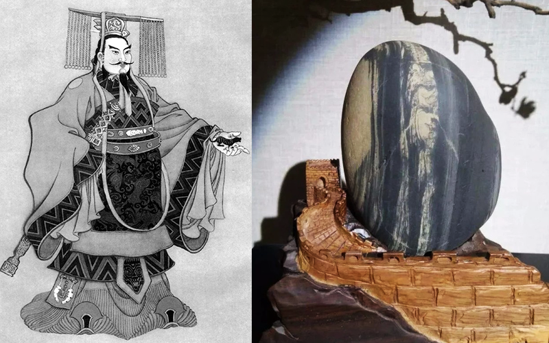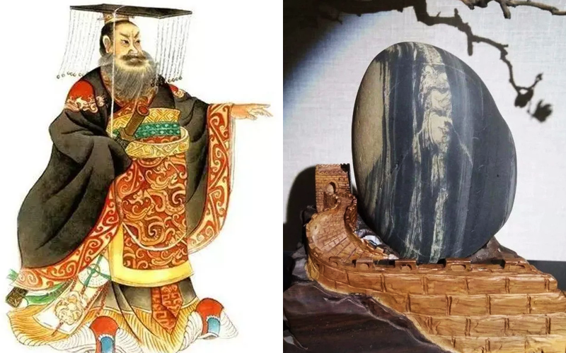 如果说一个石头上的画面像秦始皇,大概有两个特征最容易被认可。第一是身材魁梧,第二是头戴冕旒。上面这个长江石呈现的是秦始皇的“面孔”,看得出有几分威严,而那若隐若现的“冕旒”才是核心特征。