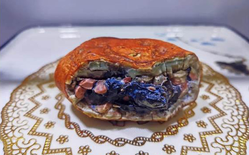 2023年盛夏,二连浩特石展,有一个“月饼”以16万成交,“月饼馅”看似用料丰富,块状结理错落有致,“月饼皮”金黄酥软,薄厚适中。真让人不禁怀疑,难道是千万年前的月饼形成的化石?