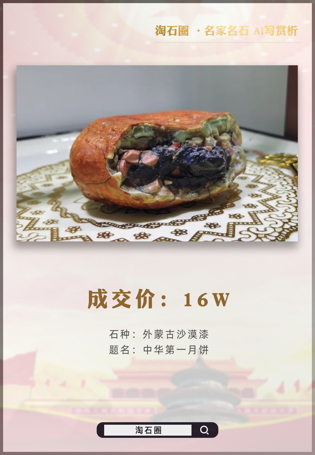 在玩石头的圈子里,具象的精品奇石一直都是大藏家钟爱的对象,小鸡出壳是具象,和田玉天狗是具象,东坡肉形石是具象,58万成交的萝卜是具象。具象代表了无限的升值潜力,所以这个16万的月饼真不贵!如果有可能下一次成交价可能就是58万!