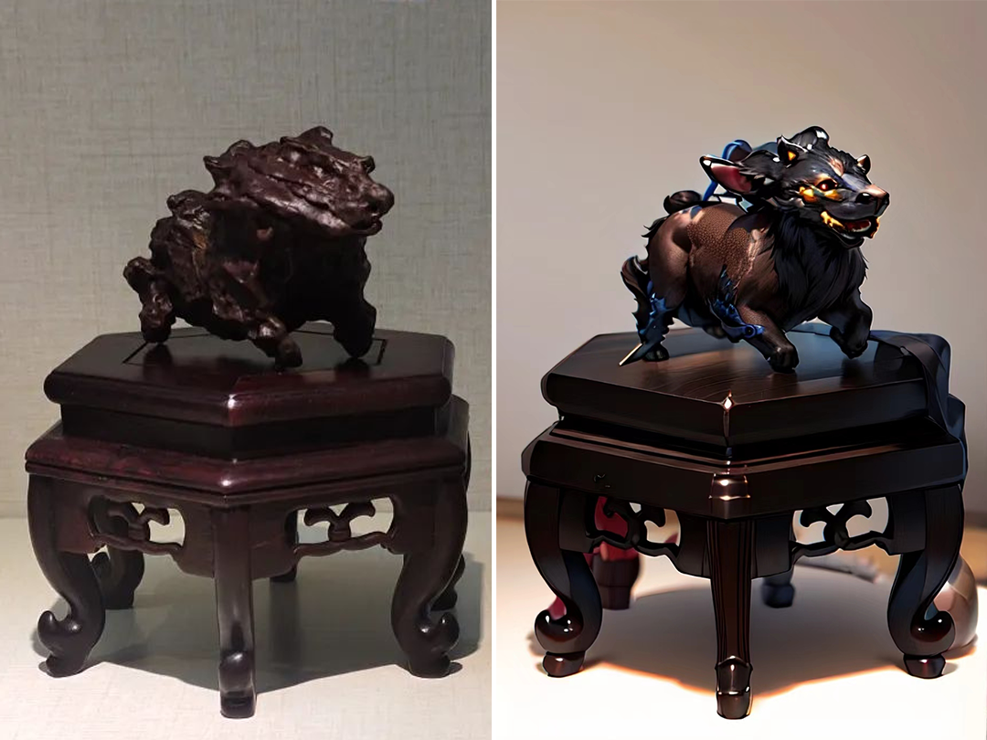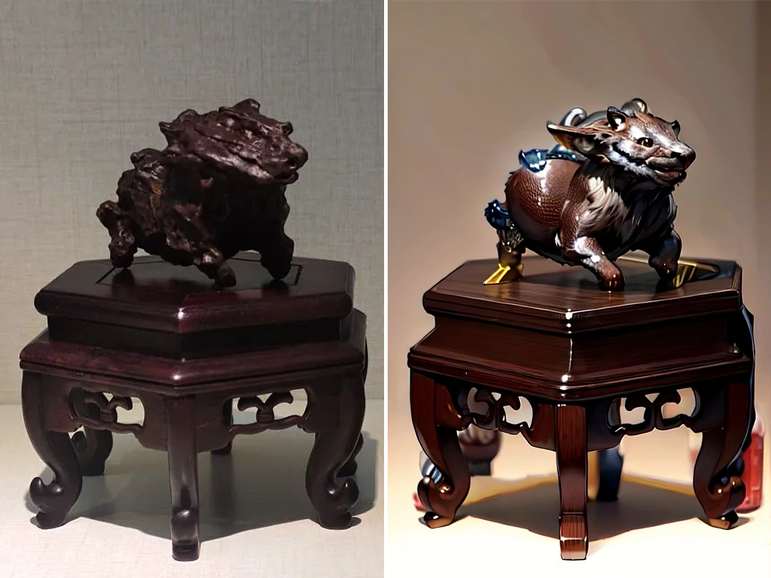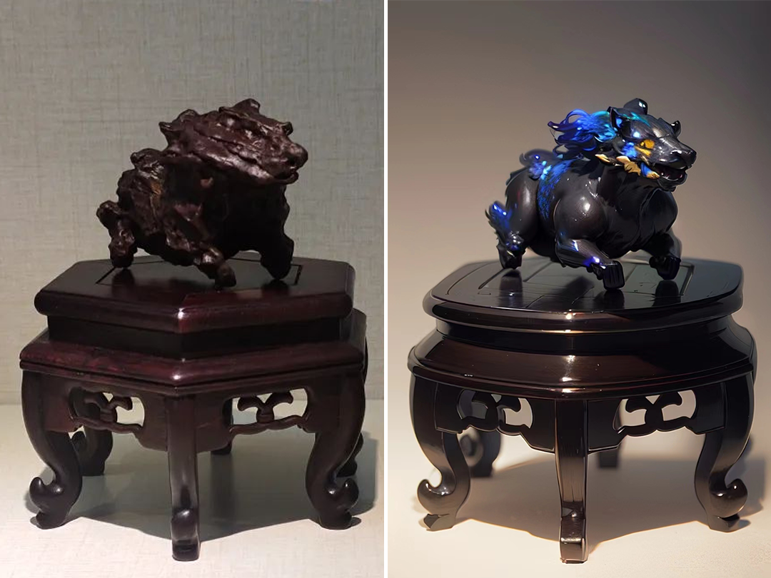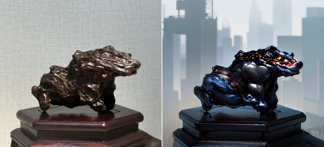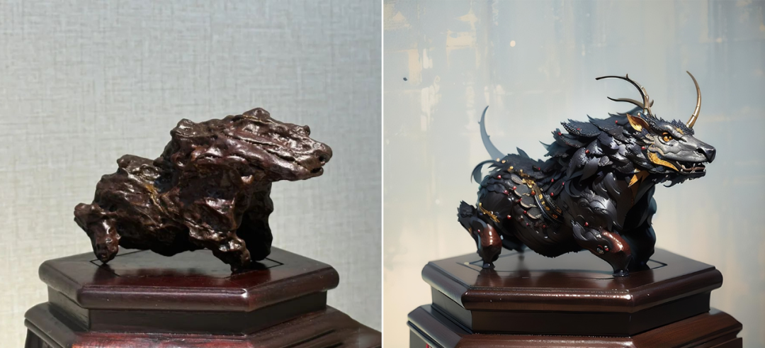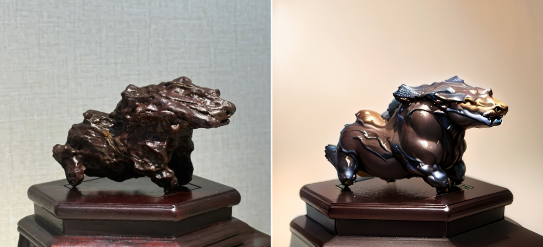 其次, “麒麟献瑞”与传说中的麒麟惊人相似。据《瑞应图》记载,麒麟长有羊头、狼蹄,头顶圆润,身披彩色斑斓的皮毛。而“麒麟献瑞”恰如其分地展现了这一形象,身体比例恰到好处,凹凸不平的石皮仿佛是麒麟真实的皮肤,让人仿佛能看到它如真的麒麟一样。