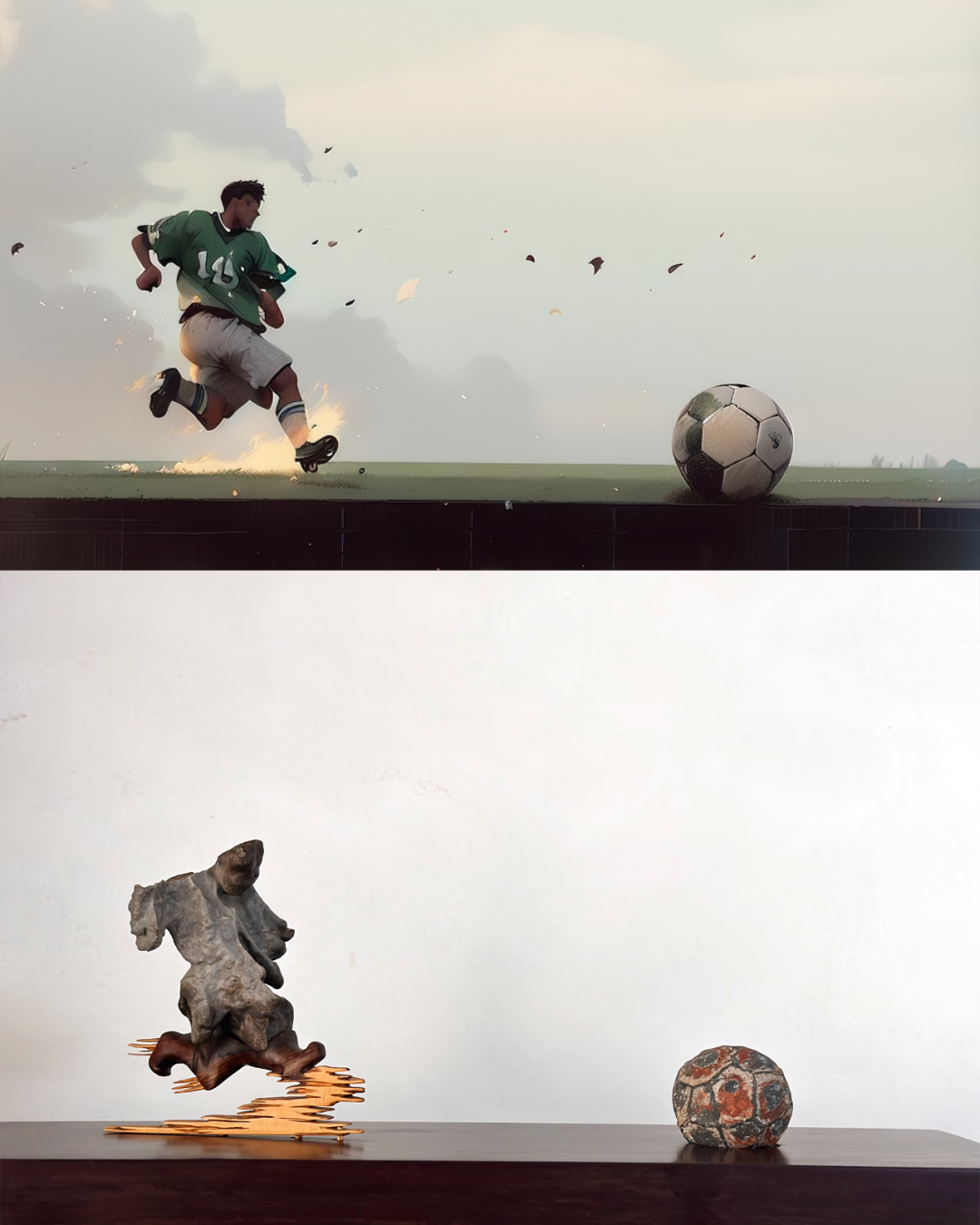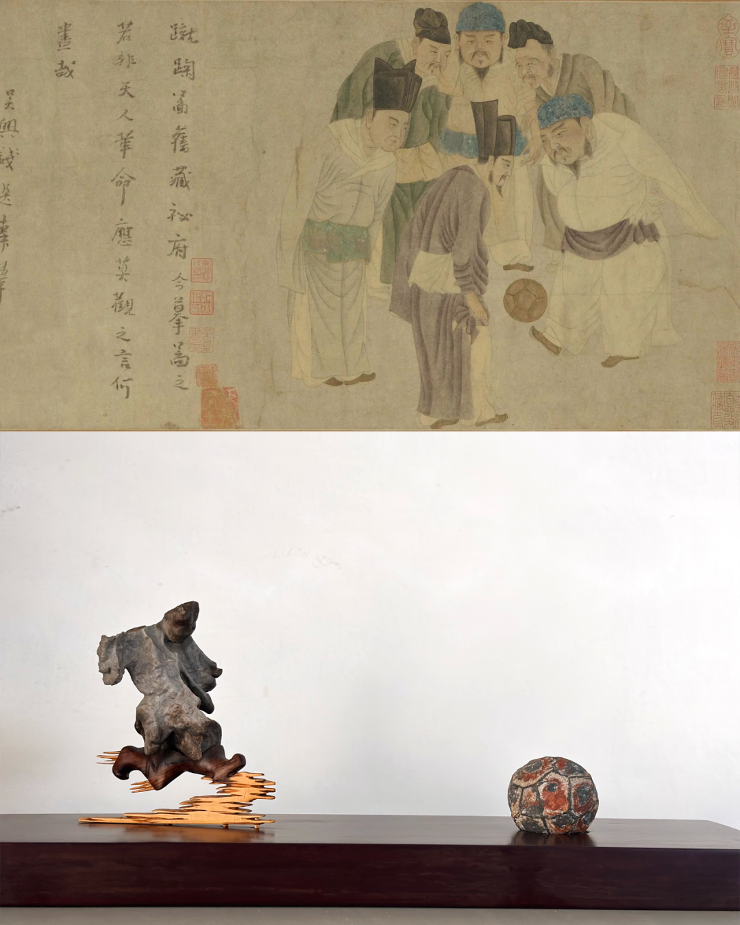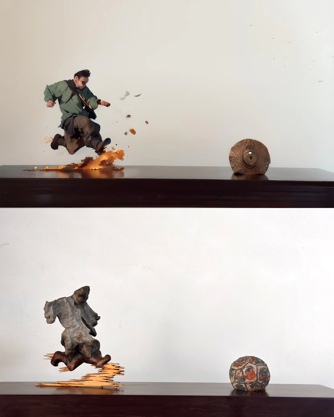 而长袍下小腿和脚的部分由木头制成,与身体完美配合,构成了完整的起脚射门的动作,让人仿佛能够听到风吹过耳边的声音,感受到“蹴鞠”激起的热浪。