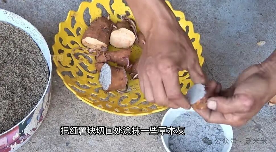 2、将红薯块的切口处抹上一些草木灰,然后就红薯块种到土里,一般几周后就会长出红薯苗。