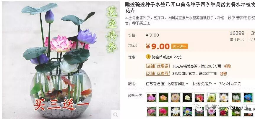 睡莲种子20粒,商家目前售价9元包邮,销量评价上万,有80种莲子种类任选。