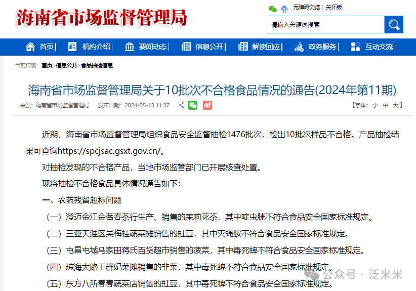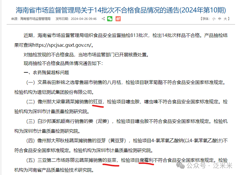 下面是海南省市场监督管理局2024年5月发布的不合格食品情况通报,农药残留超标问题里,可以看到豇豆、韭菜、菠菜等农残超标。