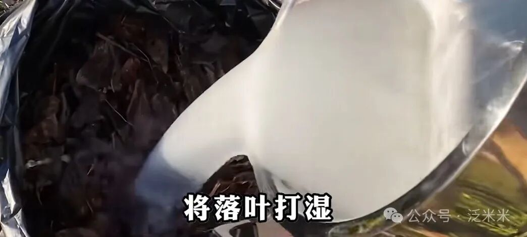 5、刚刚煮饭的淘米水没倒,拿过来浇到树叶上,将落叶均匀打湿就行。