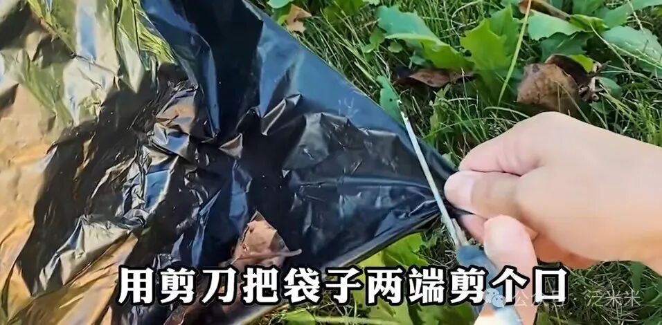 4、用剪刀把垃圾袋底部两端,各剪个口子。