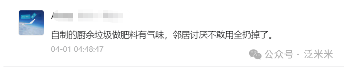 比如有菜友就曾在泛米米文章留言,自制的肥料有气味,邻居讨厌,不敢用,全部扔掉了。
