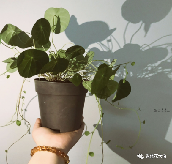 叶子像常见的铜钱草,圆滚滚,绿油油,擅长爬墙,