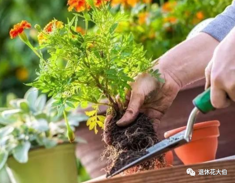 用手或工具轻轻清除花卉根部的旧土,清除时需要注意不要伤害花卉的根部。