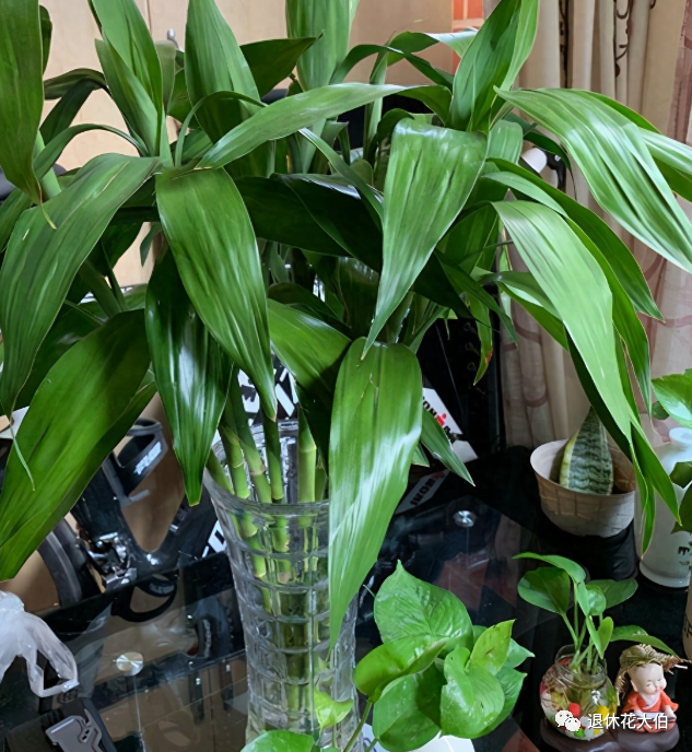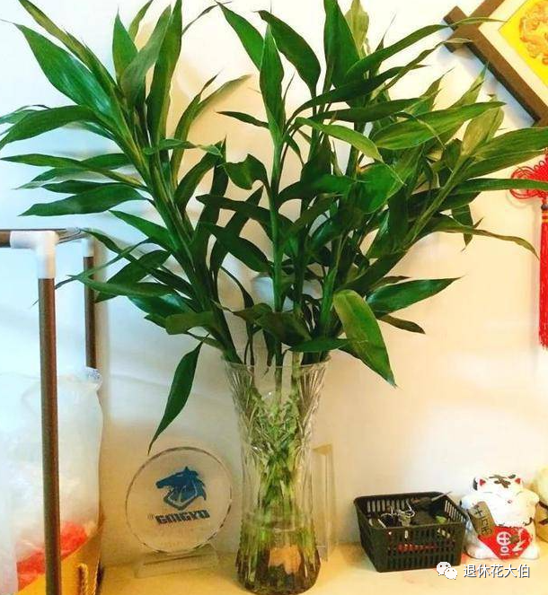 富贵竹是一种常见的水培植物,也是一种招财纳福的花。富贵竹的茎干呈淡绿色,直立或弯曲,可以编织成各种造型。富贵竹的叶子呈深绿色,线形或披针形,垂直或水平展开。富贵竹的名字寓意着富贵有余,也有“幸福竹”、“幸运竹”的别称。富贵竹适合放在客厅、书房、卧室等地方,可以增加氧气和负离子。