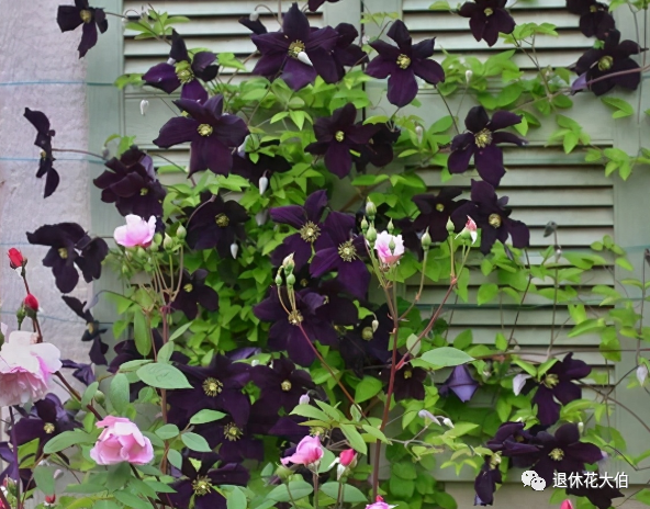 铁线莲是一种爬藤植物,它的花朵形似风铃,颜色鲜艳,有蓝、紫、粉、白等各种色彩。铁线莲的花期也很长,从春天到秋天都可以开花,而且有些品种还可以复花。铁线莲的枝条柔韧而强劲,可以攀爬在各种支撑物上,如栅栏、凉亭、拱门等,形成美丽的花墙或花廊。