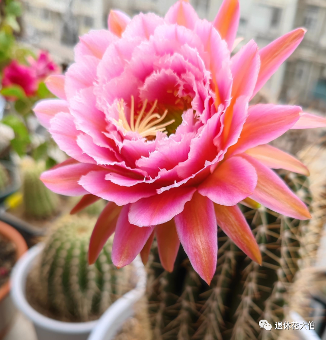 仙人球是一种仙人掌科的植物,原产于沙漠地区,具有很强的耐旱性和抗逆性。它的茎干圆滚滚的,里面储存了大量的水分,所以即使长时间不浇水也不会死。仙人球还能开出各种颜色和形状的花朵,非常漂亮。