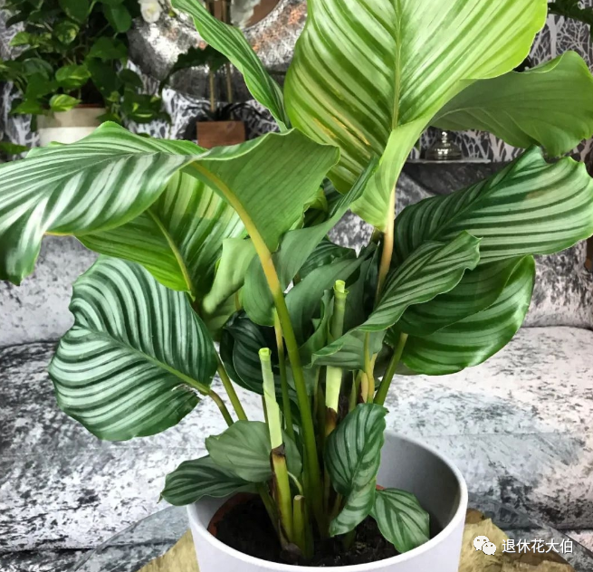青苹果竹芋不需要经常浇水,只要保持盆土湿润就行。青苹果竹芋也不需要太多的光照,可以放在半阴的地方,但是要避免暴晒和过冷。青苹果竹芋还有一个优点就是可以开花,花朵呈白色或粉色,形状像鸟嘴一样,非常有趣。