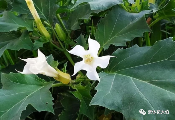 曼陀罗是一种神秘的植物,它的花朵有白、紫、粉等颜色,花冠漏斗状,花朵朝下垂,花期在夏季,花香浓郁,有一种迷幻的效果。