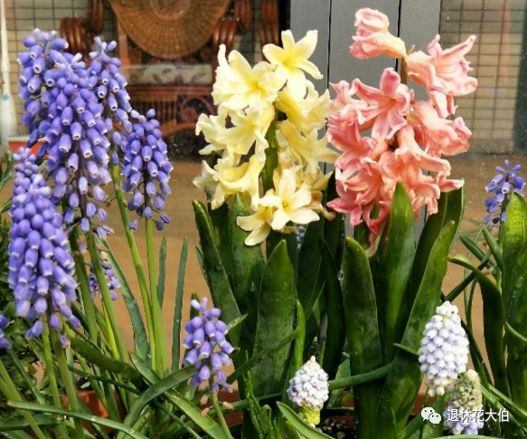风信子是一种多年生的球根草本植物,它的花朵有白、紫、粉等颜色,花形像喇叭,花期在春季,花香浓郁,是一种常见的盆栽花卉。