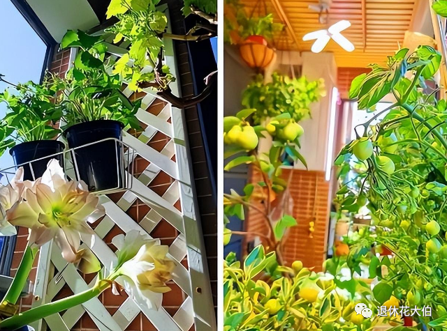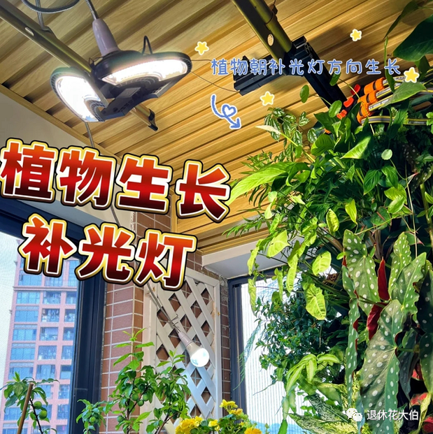 而且,为了更好地照顾植物的生长需求,自己还安排了植物补光灯,专门为喜光的植物补充够光照,毕竟这家阳台朝北,到了冬季光照就会减弱!