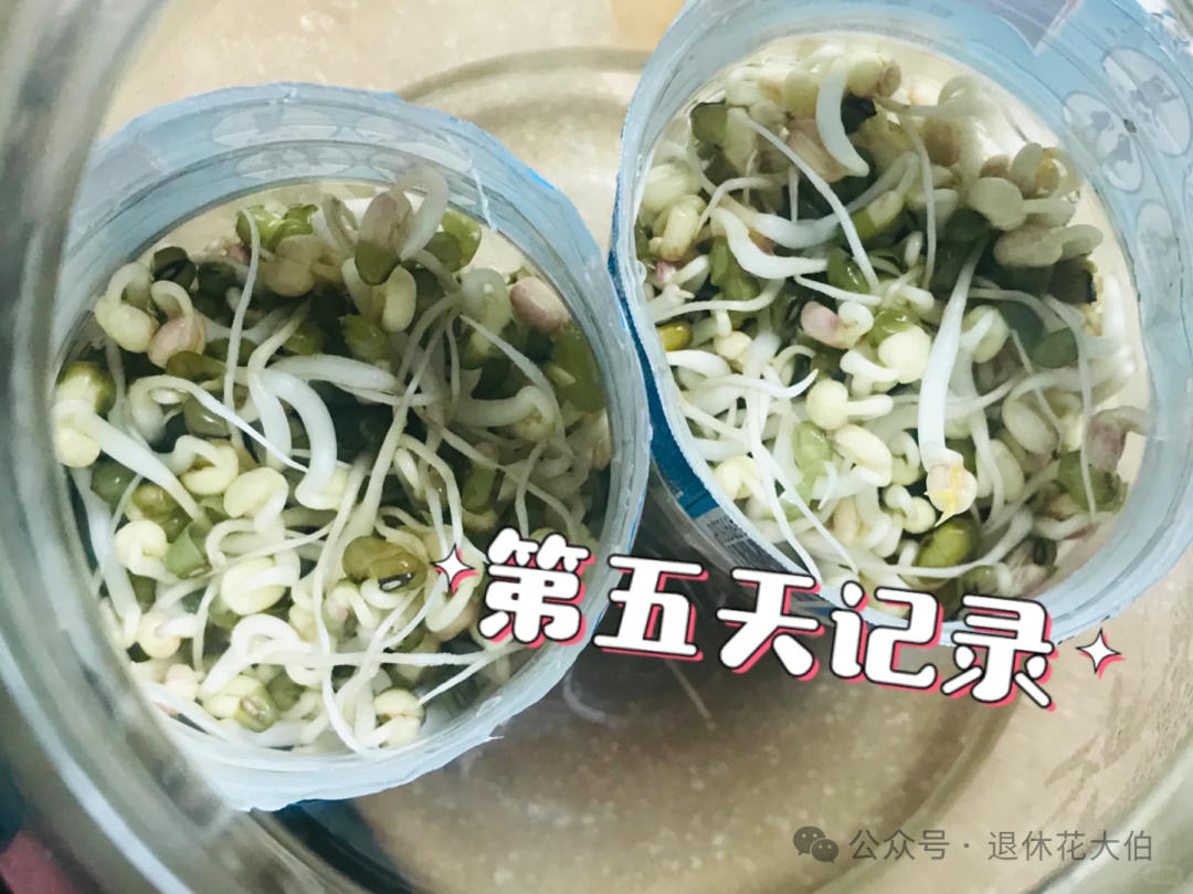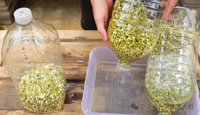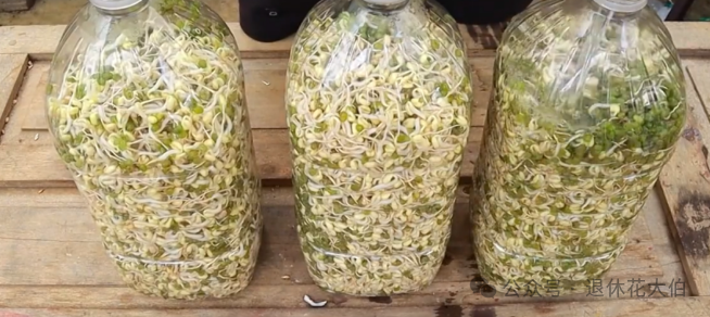 豆芽的“生长巅峰”主要集中在第二天和第三天,所以从第二天开始,我们最好间隔2小时就换水一次,通过油桶瓶盖上的小孔沥水,沥水后打开瓶盖子往里面继续倒入适量的自来水,淹没所有的豆芽,这样反复上几次,绿豆芽不到一周就可以吃了。