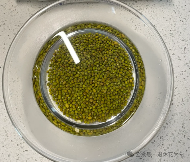 挑选出干净的绿豆之后,我们使用清水先清洗一遍,之后放入大许多的铁盆内,加上大量提前晾晒的自来水浸泡,持续上6-8小时,绿豆大概变成2倍大时,我们就可以继续下一步了。