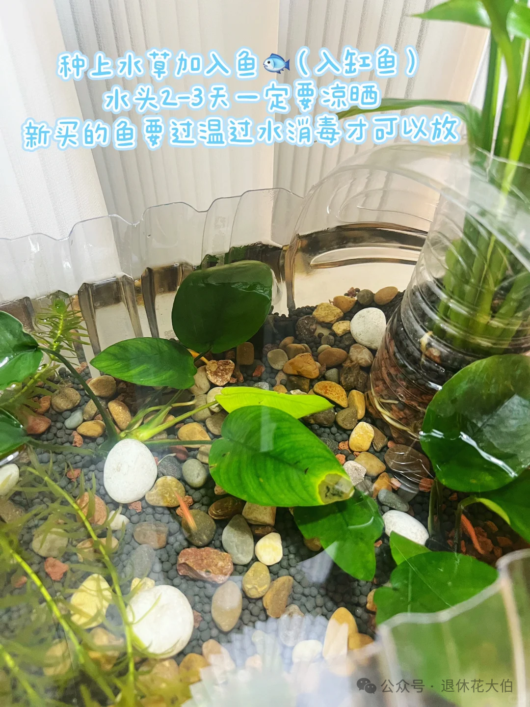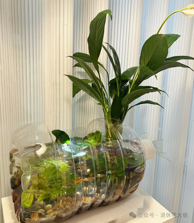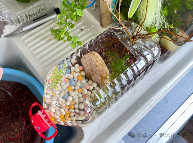 之后我们可以再种上自己喜欢的水草,用石头或小一些的塑料瓶子作为固定,这样往里面注入水之后,再放上几条小鱼就能够呈现丰富的层次感,美丽十足!
