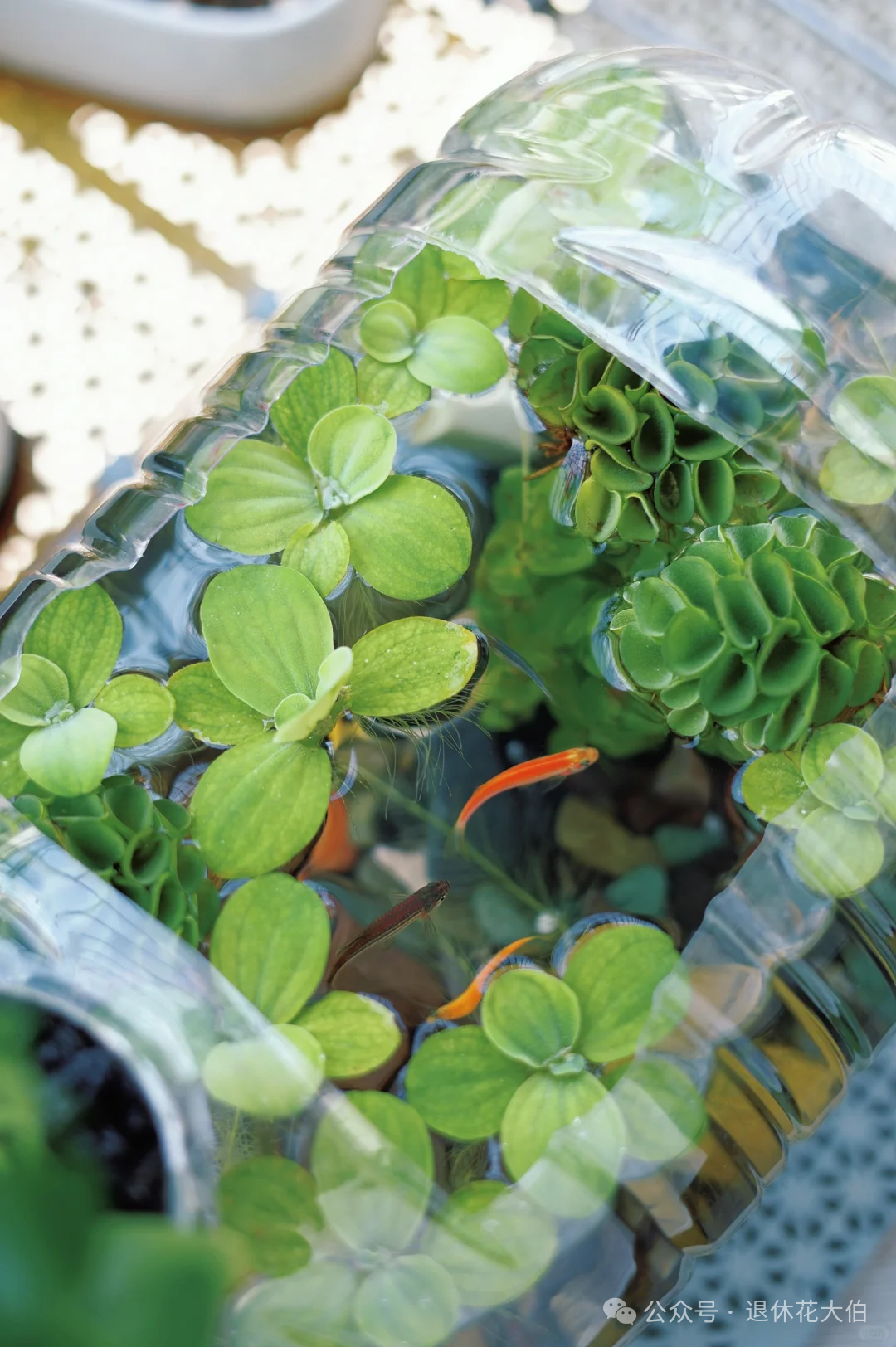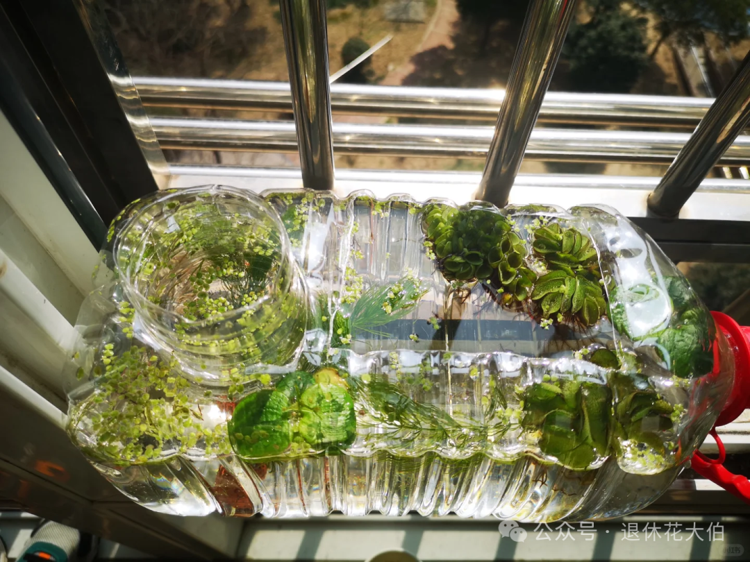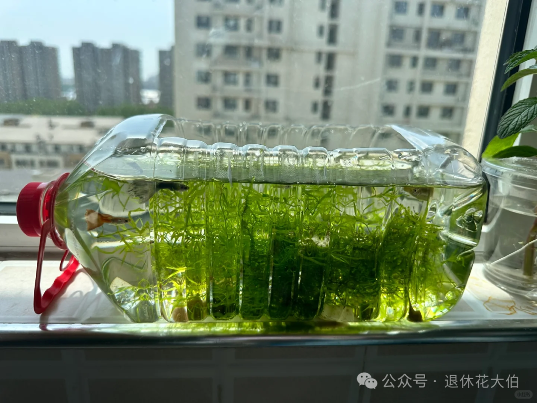 隔一段时间换换水,偶尔喂一下鱼饵,里边的小鱼就会在接近于大自然的环境中健康的生长。