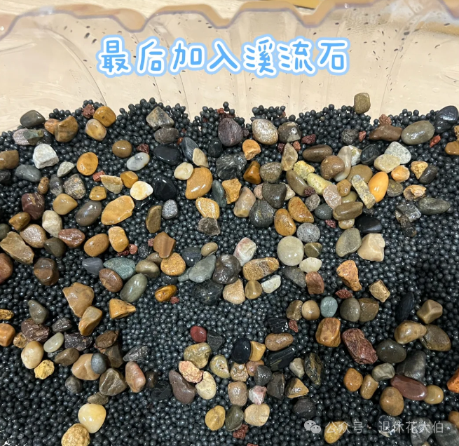 我们首先要把清洗干净的火山石和水草泥放入矿泉水桶的底部,然后再铺垫上溪流石,这样就会营造出一种自然又和谐的层次美。