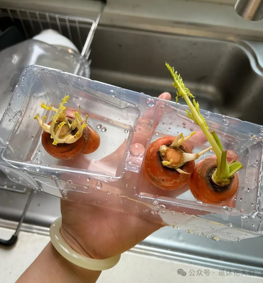 注意:胡萝卜没有长出根须之前用太多的水会导致胡萝卜泡水腐烂。