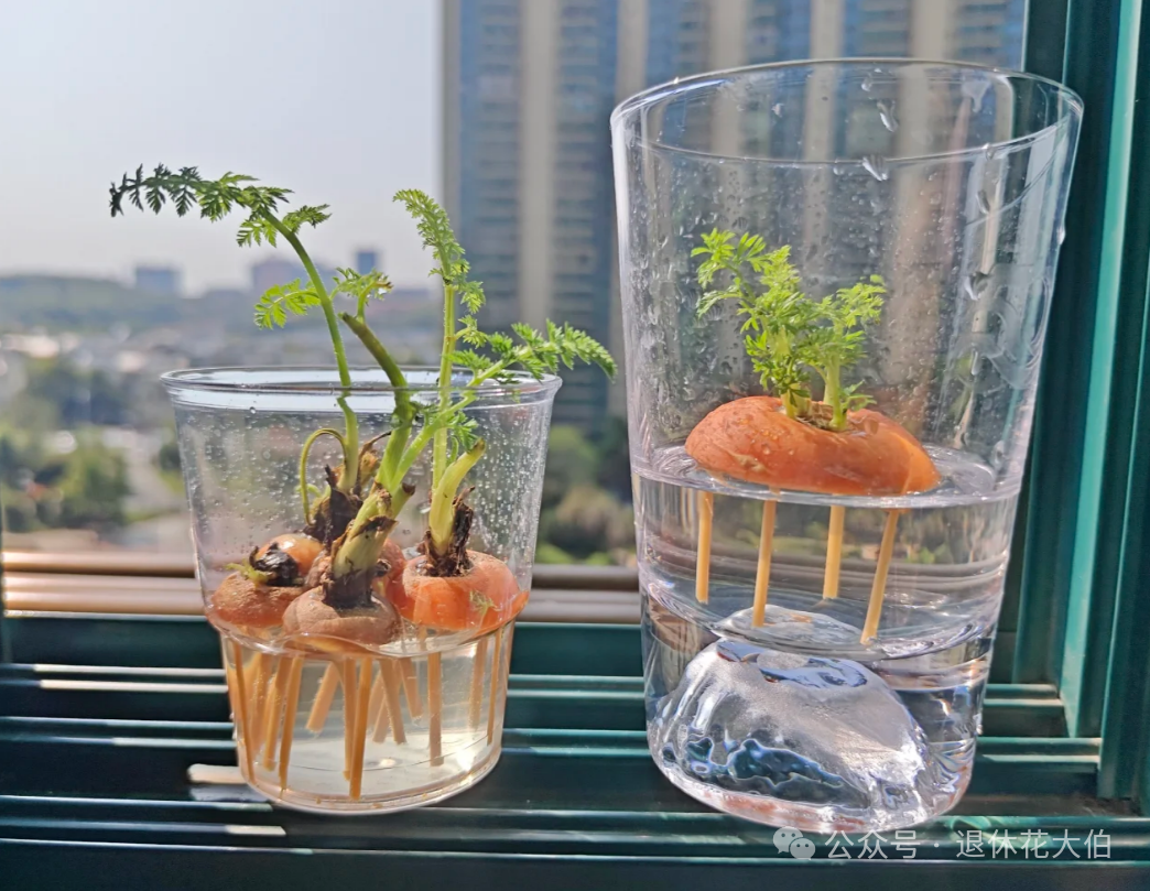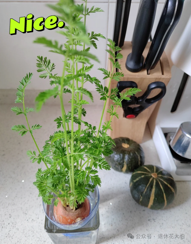 而且即使不为了它能够结出新的胡萝卜,我们把吃完的胡萝卜头放到水里水培,那么等上十天半个月也能收割一波胡萝卜樱子,这也是一道不输于“极品野菜”的天然美味。