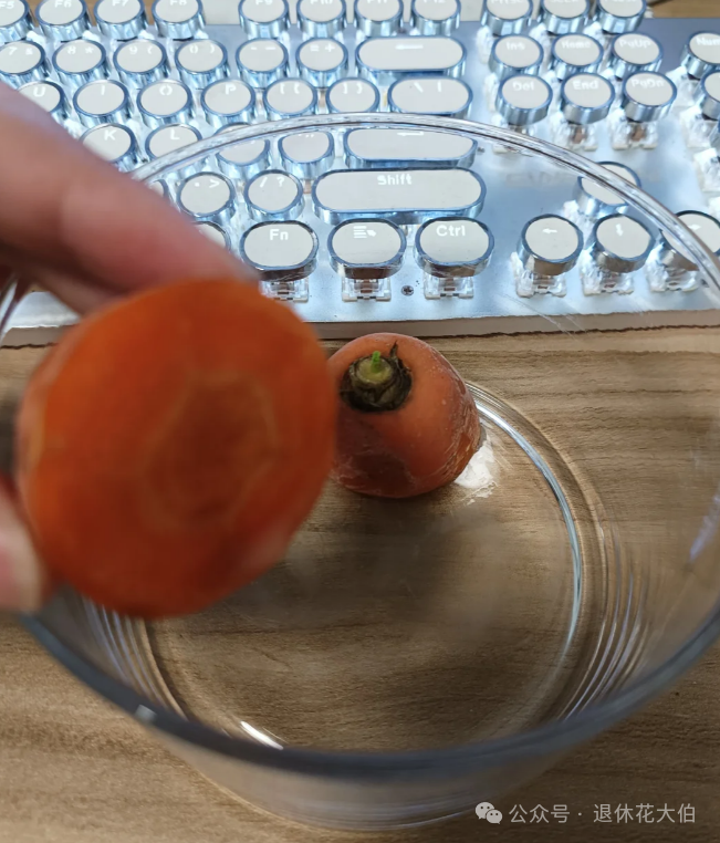 所以我们水培胡萝卜最好是用新鲜的胡萝卜,并且保证它的根部至少有2厘米,因为胡萝卜生根发芽期间消耗的营养物质主要来源于自身。