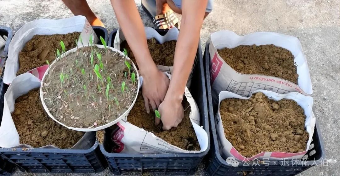 育苗的时候,一个编织袋就可以培育许多的玉米苗,但是它们生长需要足够的空间,所以在玉米苗长到20cm左右的时候,我们就要拔掉里边瘦弱的玉米苗扔掉,只留下健壮的玉米苗,移栽到不同的编织袋里。