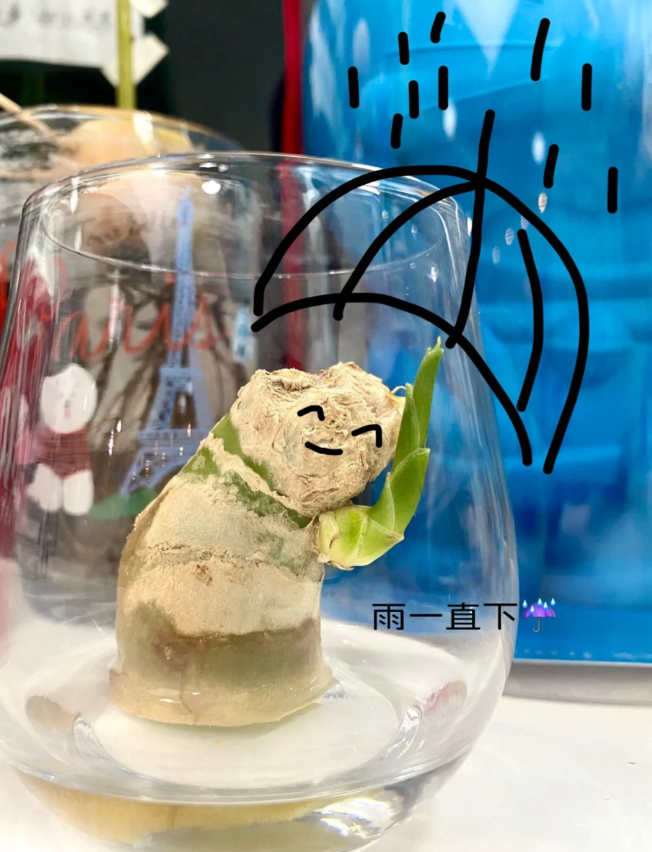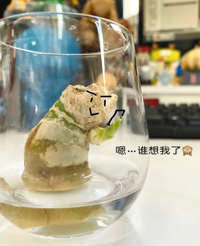 小伙子用的是透明的玻璃杯,可以随时观察生姜的状态。但若是我们,可以选同款,也可以选择其他的容器,只要保证生姜1/3都能被水淹没即可。