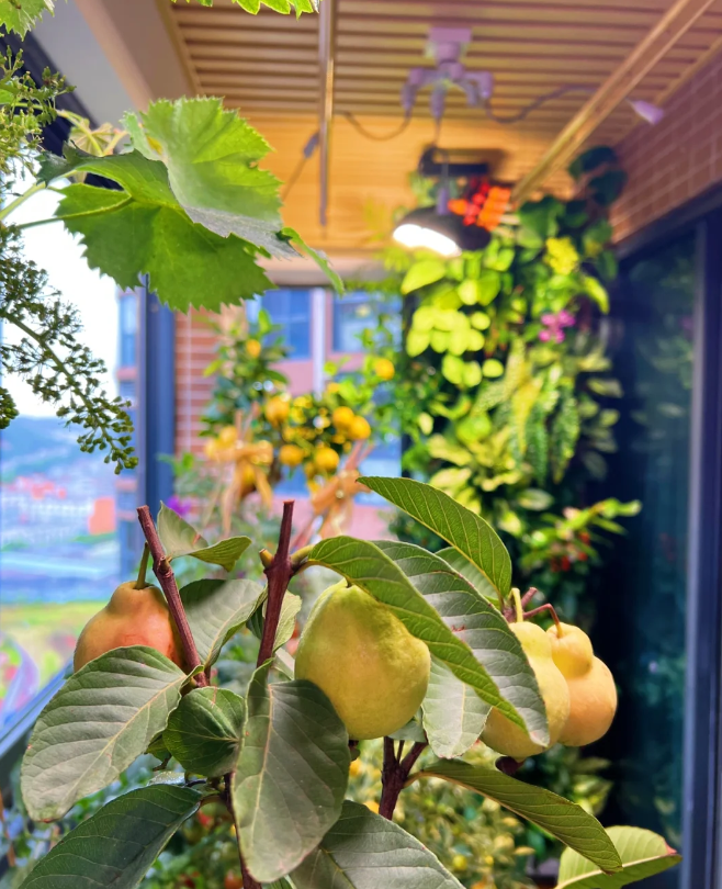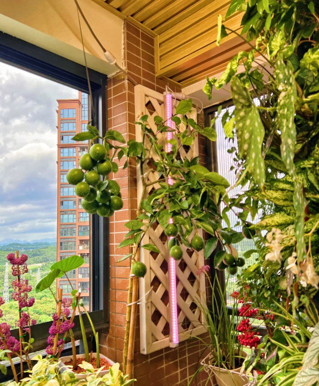 她在自家的阳台上,采用了植物补光灯,这样即使是阴天或者是缺乏光线的冬季和春天,也能够保证每个植物获取每天8小时以上的光照。