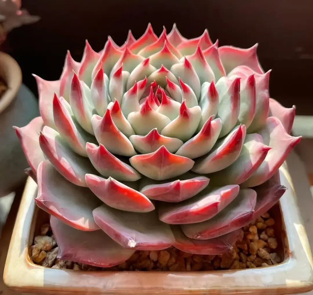 本来没有抱什么希望,觉得只要养活就行了,万万没想到因为采光好,所以这盆多肉在春夏的时候直接染上了漂亮的糖果色,居然比花还漂亮,还独特!