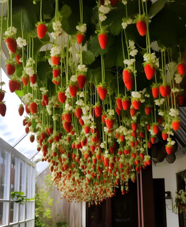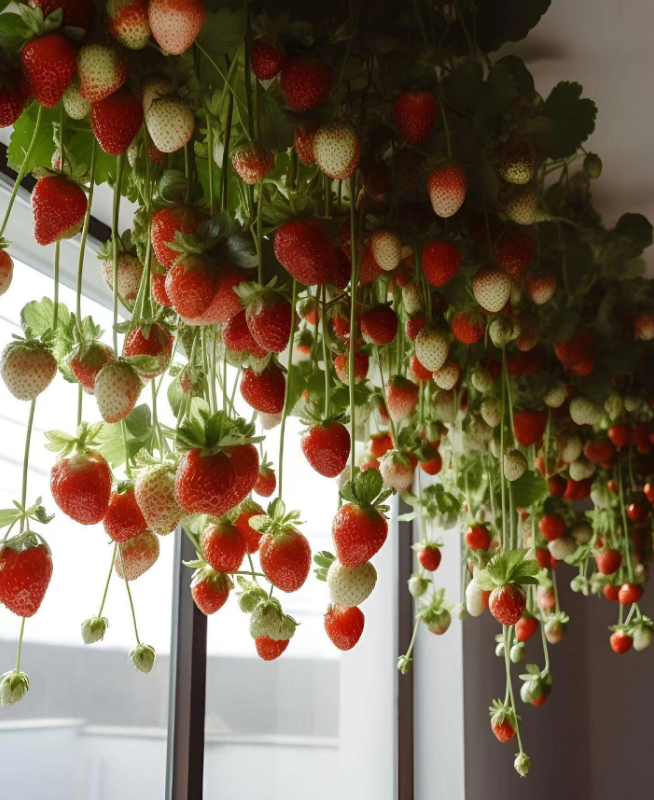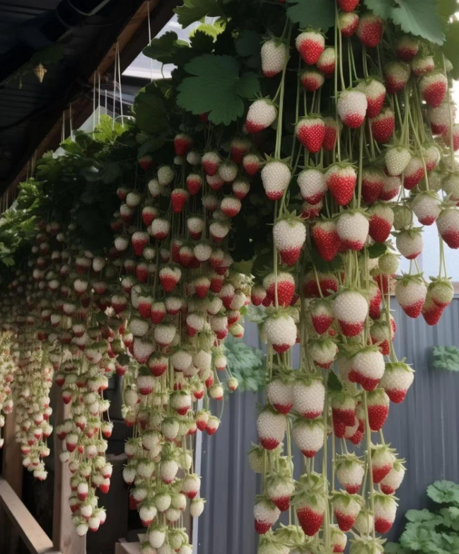 大棚里使用的是100%的天瀑种植技巧,但在家里,我们可以做个简易版本的,既能打造成一片具备观赏价值的草莓瀑布,同时还能从此实现草莓自由。