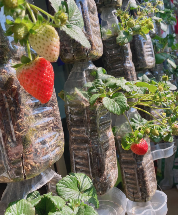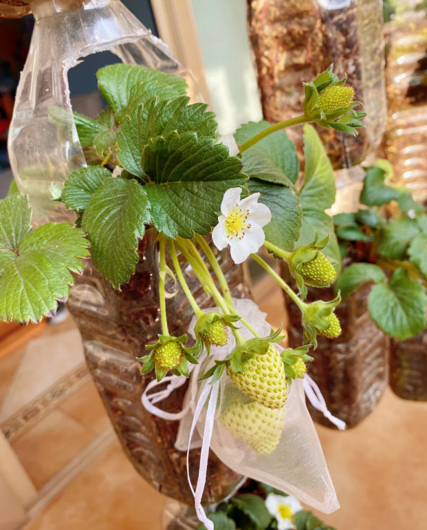 塑料瓶的上部分则倒扣在下部分里面,同时在上部分里面填充上适合种植草莓的土壤。