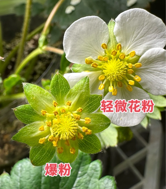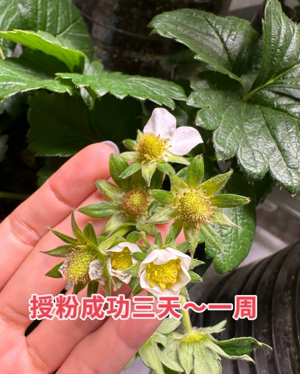如完成授粉后,我们可以在土壤里埋上一些缓释肥,全面补充多种微量元素;往枝叶上喷洒坐果药,这样草莓授粉成功的几率就会高许多,会长出更多的小草莓。