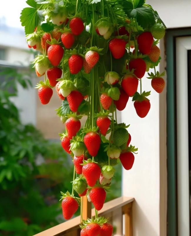 这宛若一个瀑布一样,绿色的叶子隐藏在一片或红或白的草莓中,美极了!