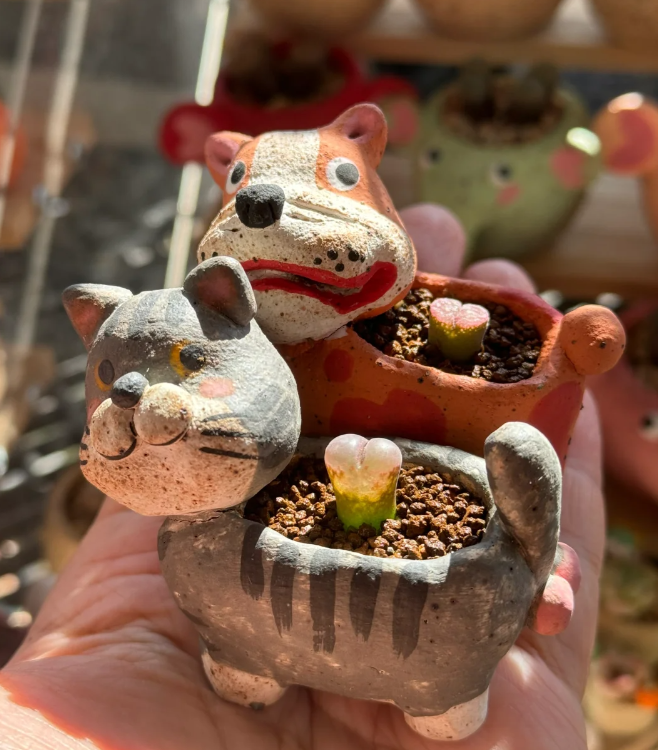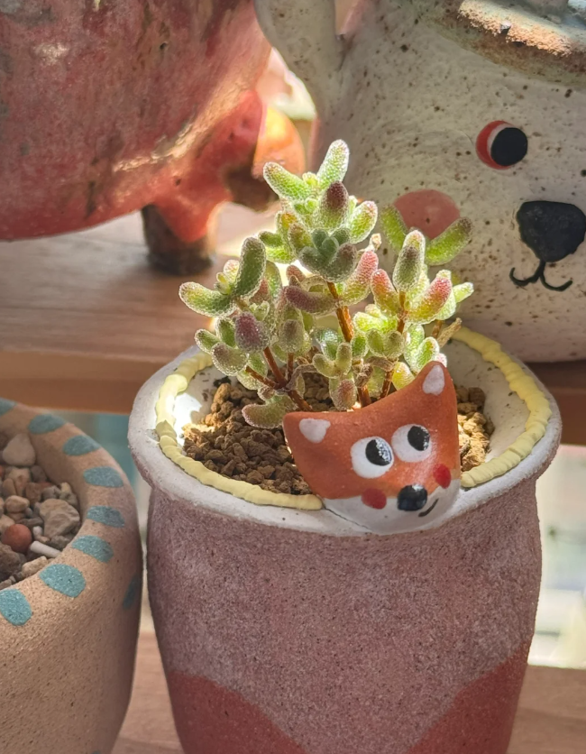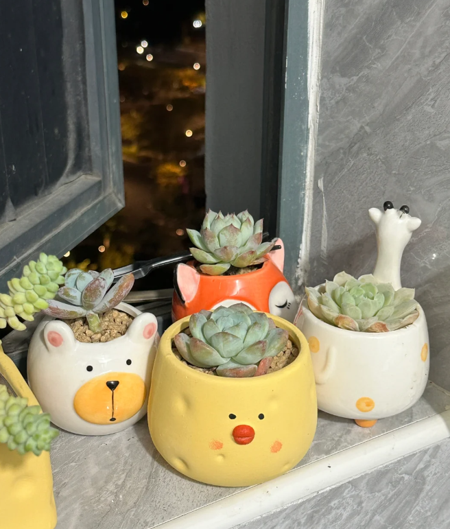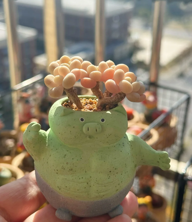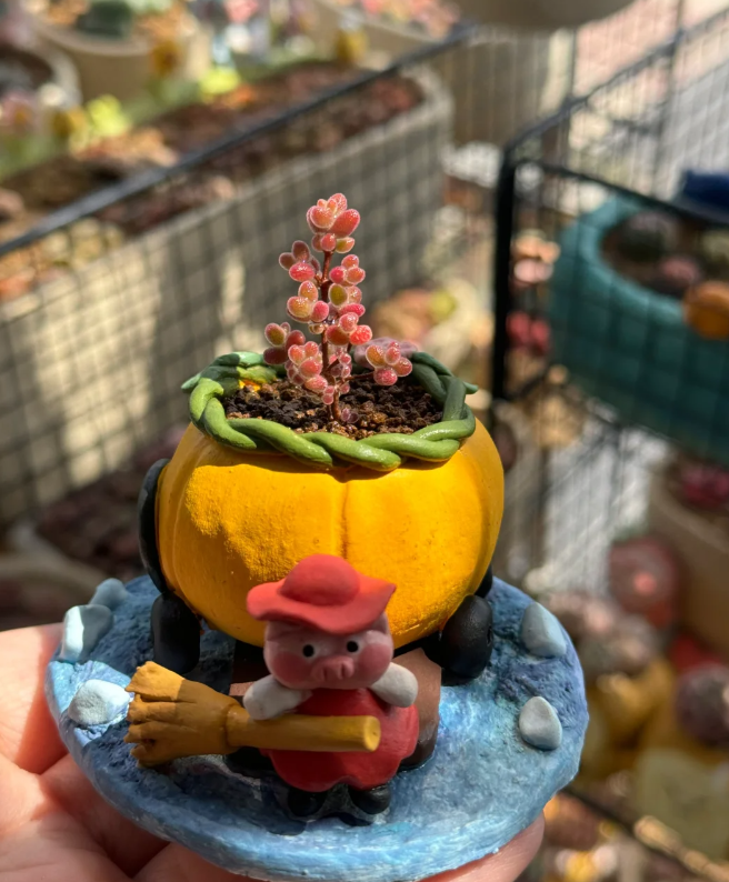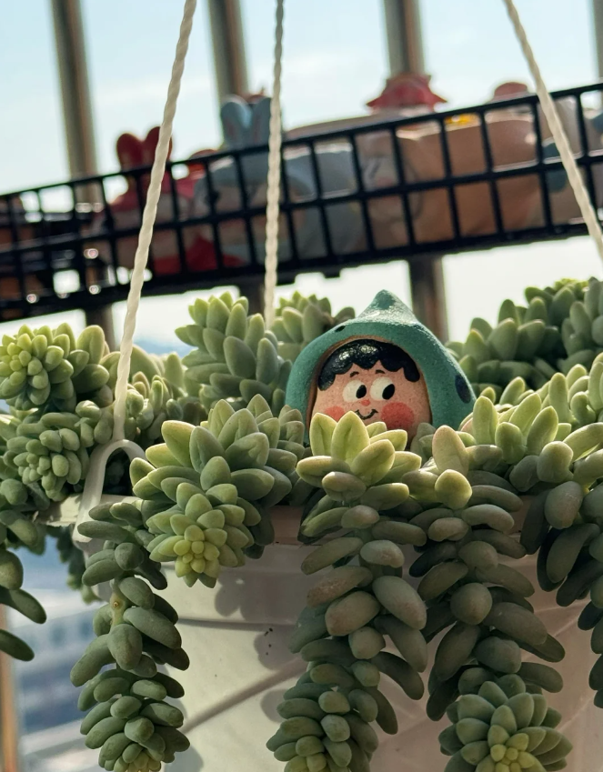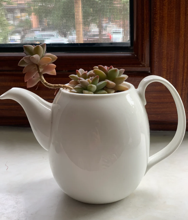 所以我们也可以像她这样选择一些比较具有特色的花盆,比如娃娃花盆、茶壶花盆……,然后选择和其颜色百搭的多肉品种种植即可。