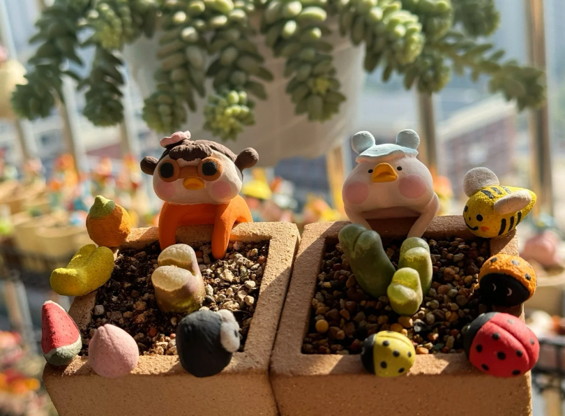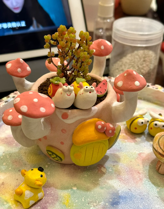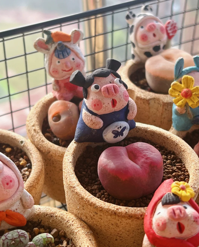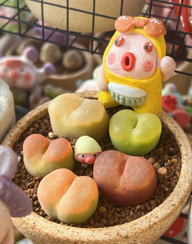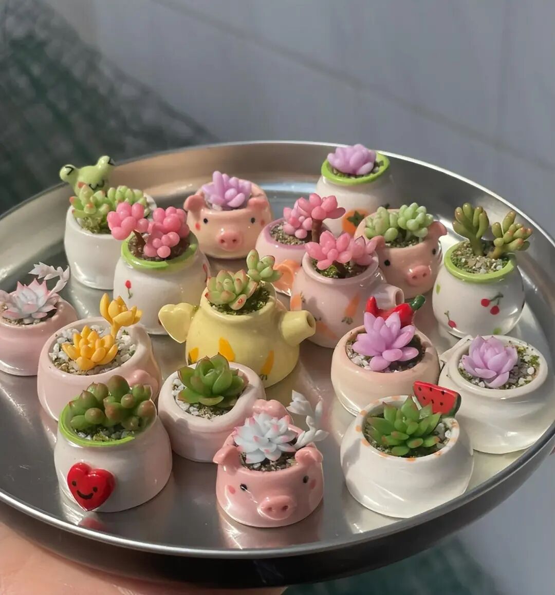所以我们也可以像她这样选择一些比较具有特色的花盆,比如娃娃花盆、茶壶花盆……,然后选择和其颜色百搭的多肉品种种植即可。