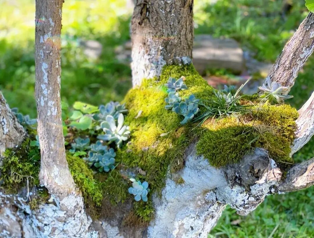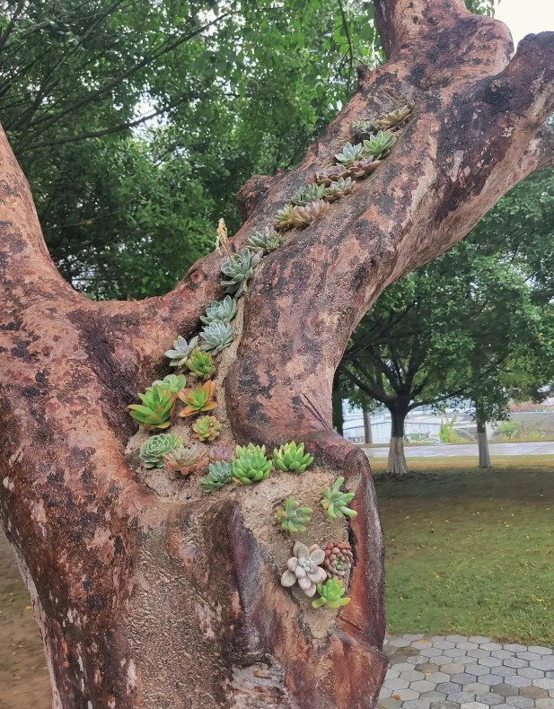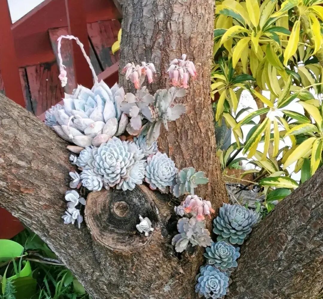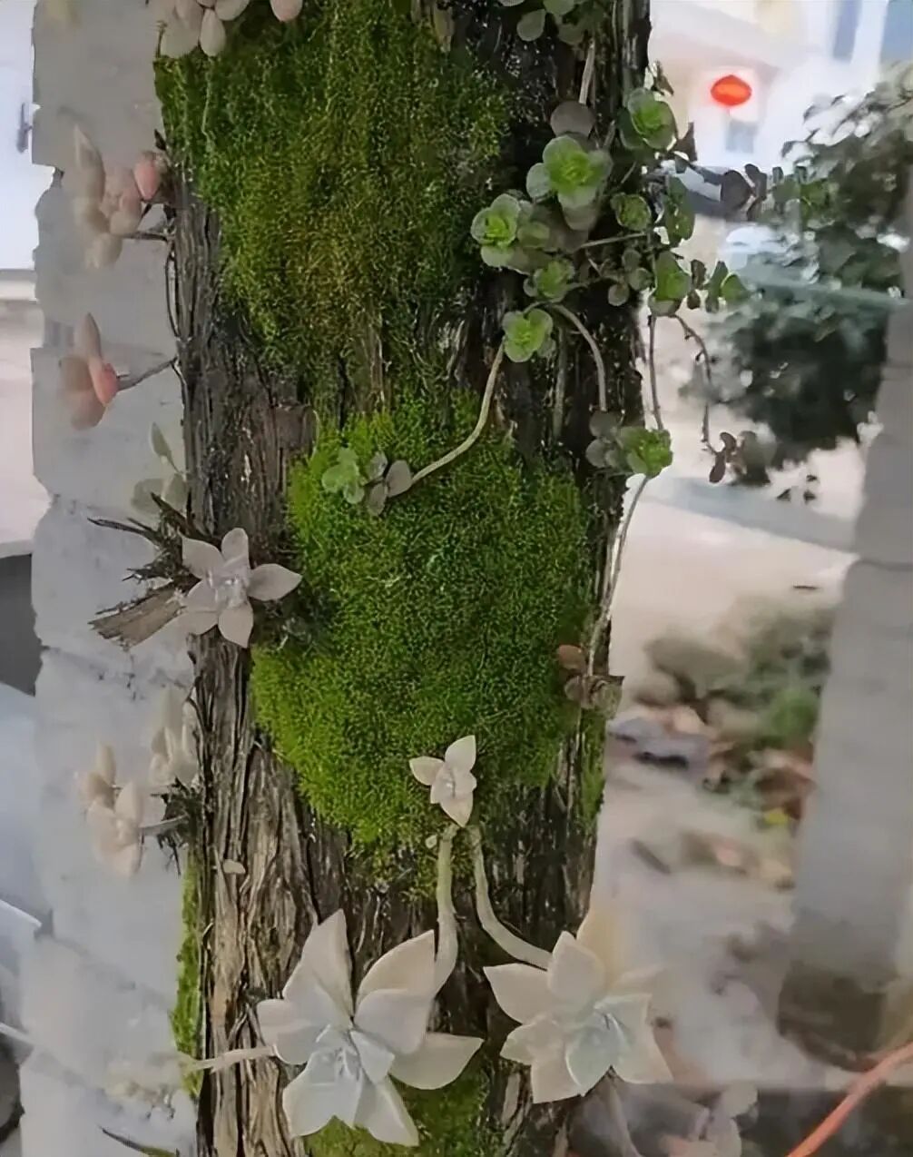 因为她直接把多肉种植在了生长中的大树上,结果不仅多肉没死,大树没有受到影响,反而两者结合在一起,造型更加独特好看,长势也更好了!