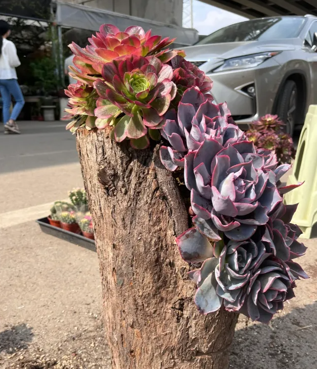 她选择的树木是杉树,一种外皮非常容易剥落的植物,然后就剥掉外皮,往缝隙中填充一些土壤之后种植一种名为胧月的多肉。