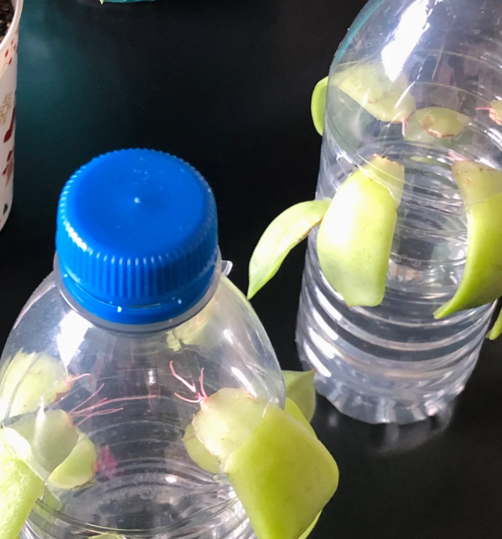 摘取一些健壮完整的多肉叶子,把它们插入装有水的塑料容器中放在光照充足,通风良好的地方。这样即使不管一段时间之后,多肉的叶子也会长出红色的根须和新的叶子。