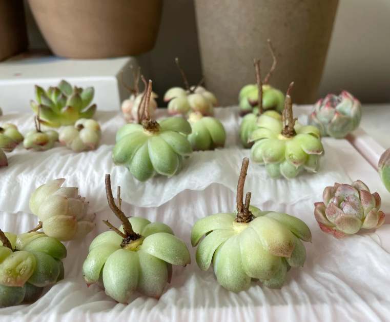所以到了差不多这个时候,为了让多肉植物呈现更美的状态,很多人都会修剪一下多余的花头!这个时候我们就可以利用多余的花头培育幼苗。