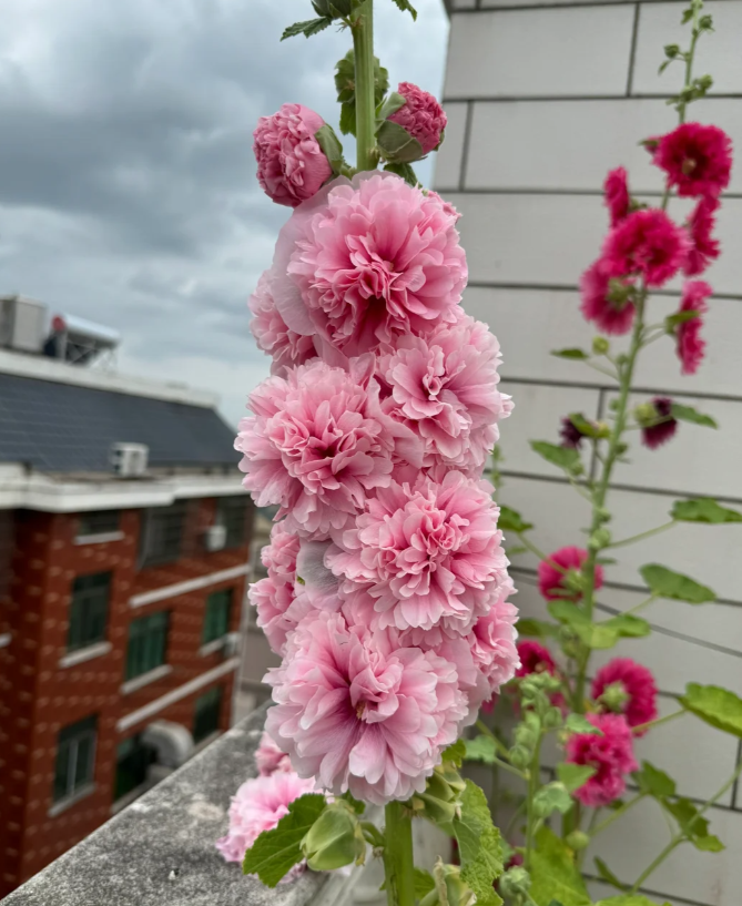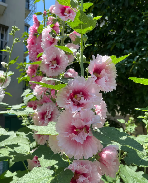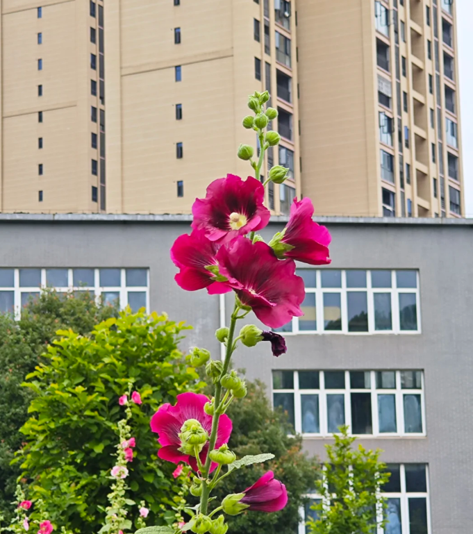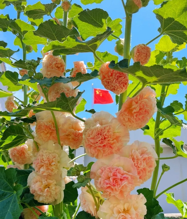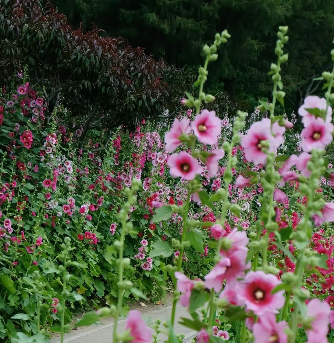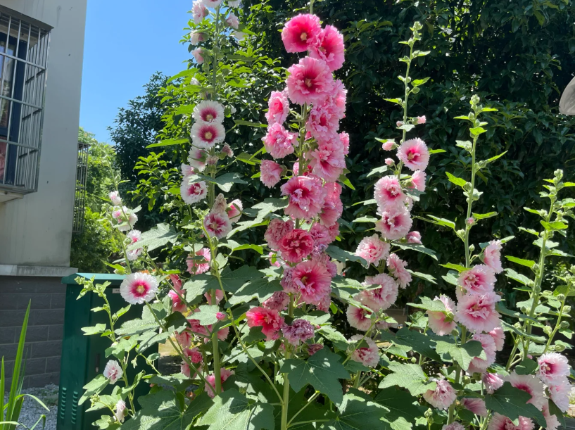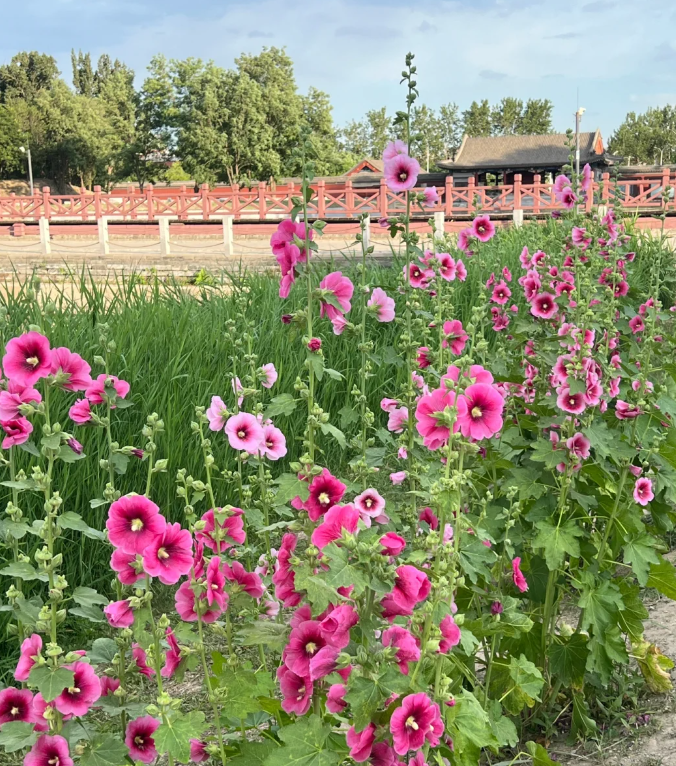 蜀葵的花期非常长,通常从端午节前就开始盛开,一直持续到8月。