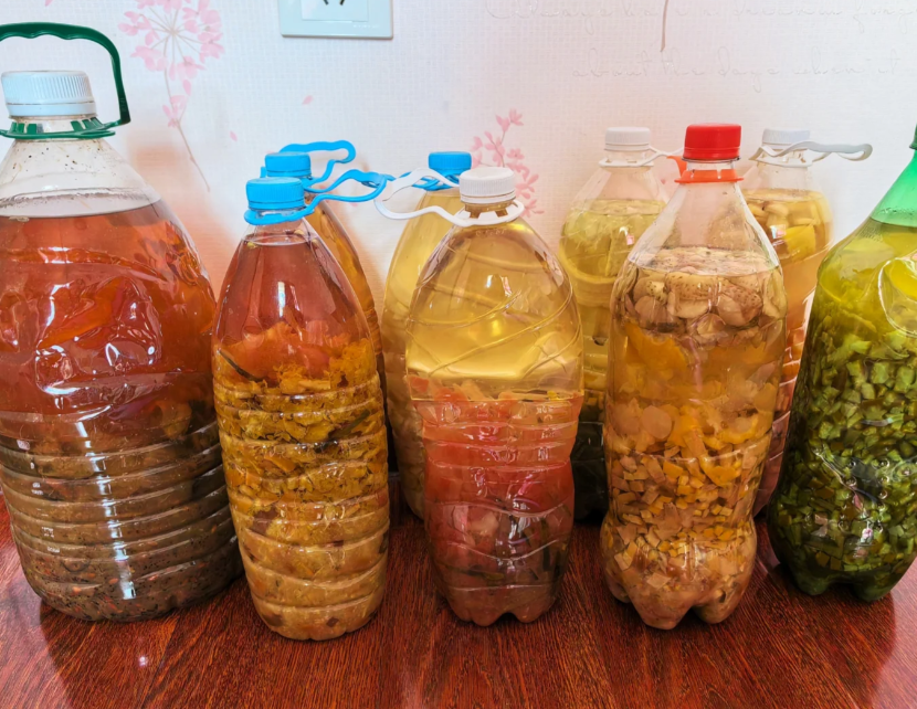 ①把果皮菜叶子剁碎,加上一些淘米水放在矿泉水瓶里面,这样两个月后就可以得到弱酸性的酵素肥了,养啥旺啥!