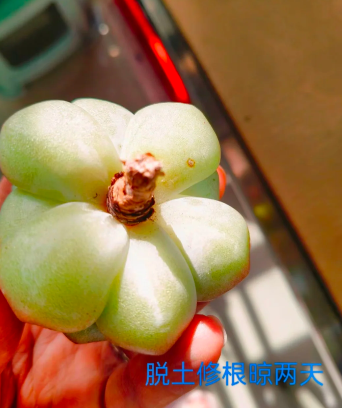 我们要提前控水,在土壤干燥的时候敲击花盆的外面,然后倒扣,小心的护着多肉植物的花头,然后再慢慢的梳理干净根部上挂着的土壤,尽可能的减少脱盆对多肉根茎叶的伤害。
