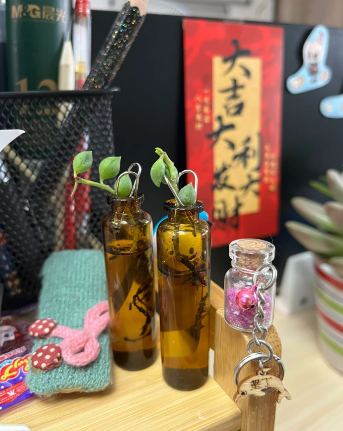利用各种各样废弃的小瓶子水培,既能帮助多肉植物平安度夏,又能欣赏到不一样的景观,一举数得,何乐而不为!