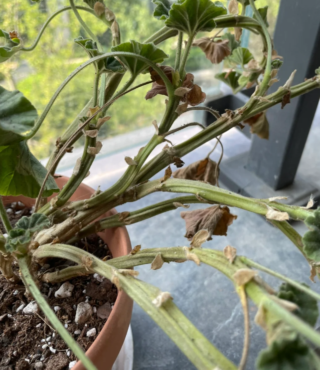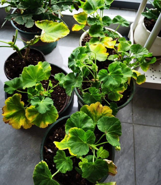 当土壤过于干燥时,为了自保,天竺葵会切断对老叶片的水分供应,优先保障新生叶片的水分需求。这样一来,老叶片便会因缺水而发黄枯萎。