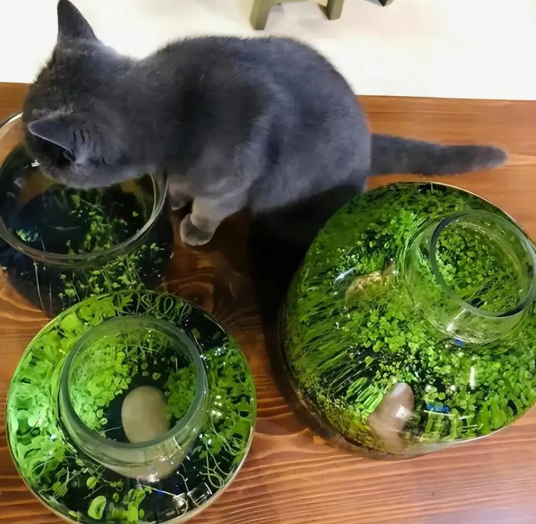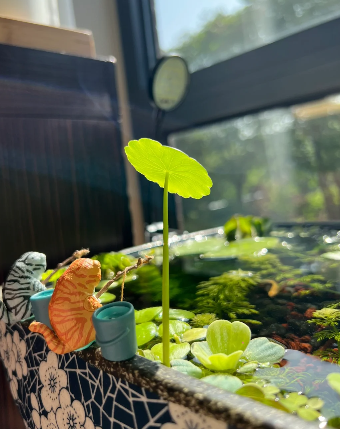 就连家中的猫就忍不住被这份美好打动,近一点,再近一点,静静的感受铜钱草和鱼和水……所蓬勃出的生命力!