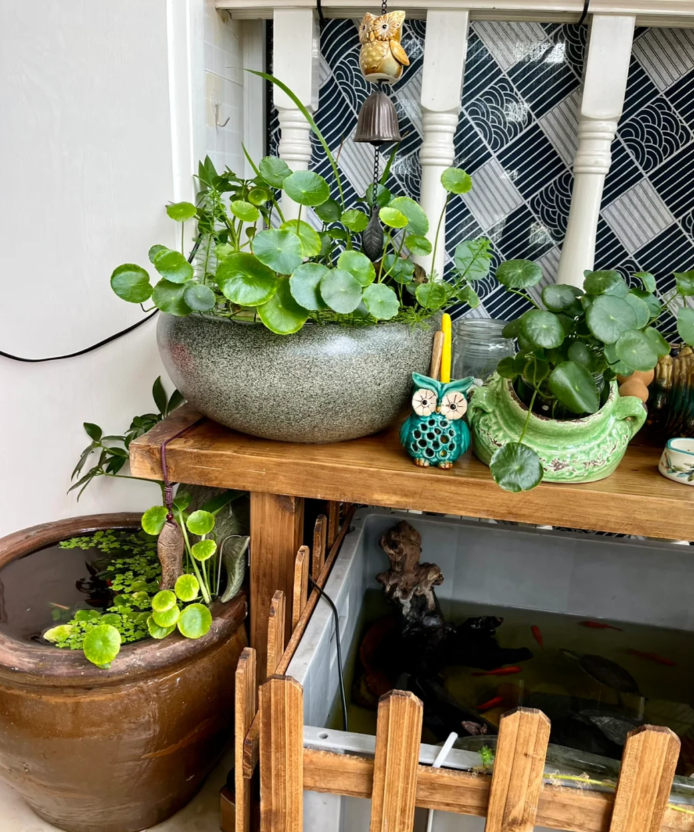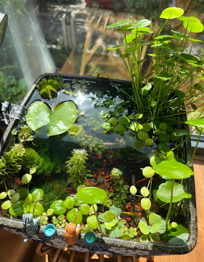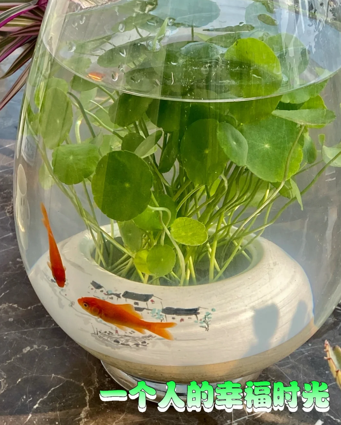 但重庆的一个太太把铜钱草泡在鱼缸里种植,也是让人万万想不到的,更何况在这样的情况下,铜钱草还被赋予了更奇特的魅力,虽然外形看着普通,却像水中野草一般生机勃勃,透过透明的玻璃浴缸看,它和游动的小鱼相映成趣,看着那叫一个纯净安详又高级!