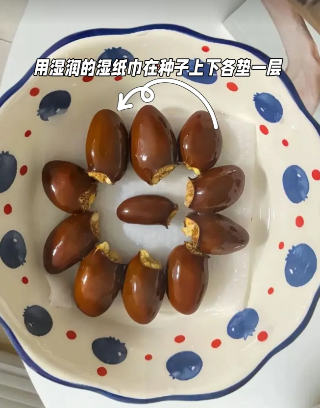 一般浸泡3-7天后,把荔枝核放在可以一直保持湿度的卫生纸上面,荔枝核就会长出嫩绿的叶子。